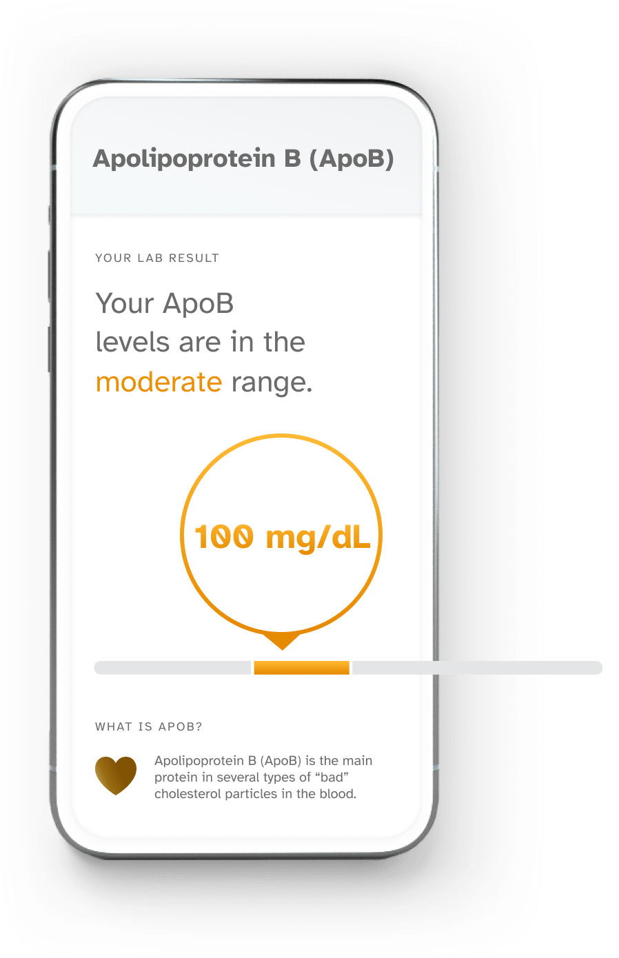 Image Description: A sample result for Apolipoprotein B (ApoB) report; "Your ApoB levels are in the moderate range." What is ApoB? Apolipoprotein B (ApoB) is the main protein in several types of “bad” cholesterol particles in the blood.