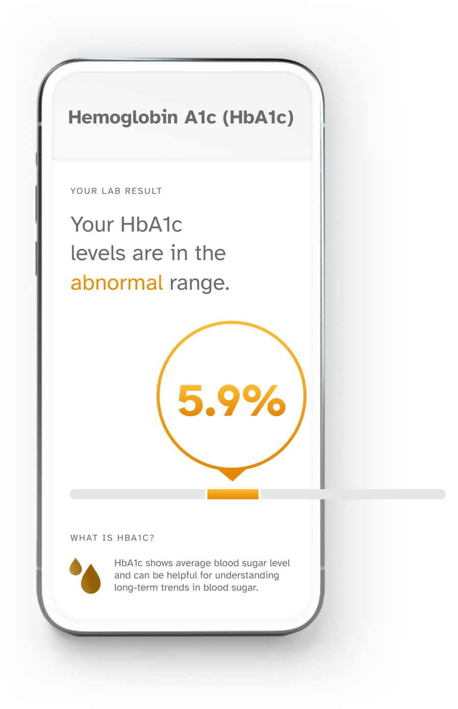 Image Description: A sample result for Hemoglobin A1c (HbA1c) report; "Your HbA1c levels are in the abnormal range." What is HbA1c? HbA1c shows average blood sugar level and can be helpful for understanding long-term trends in blood sugar.