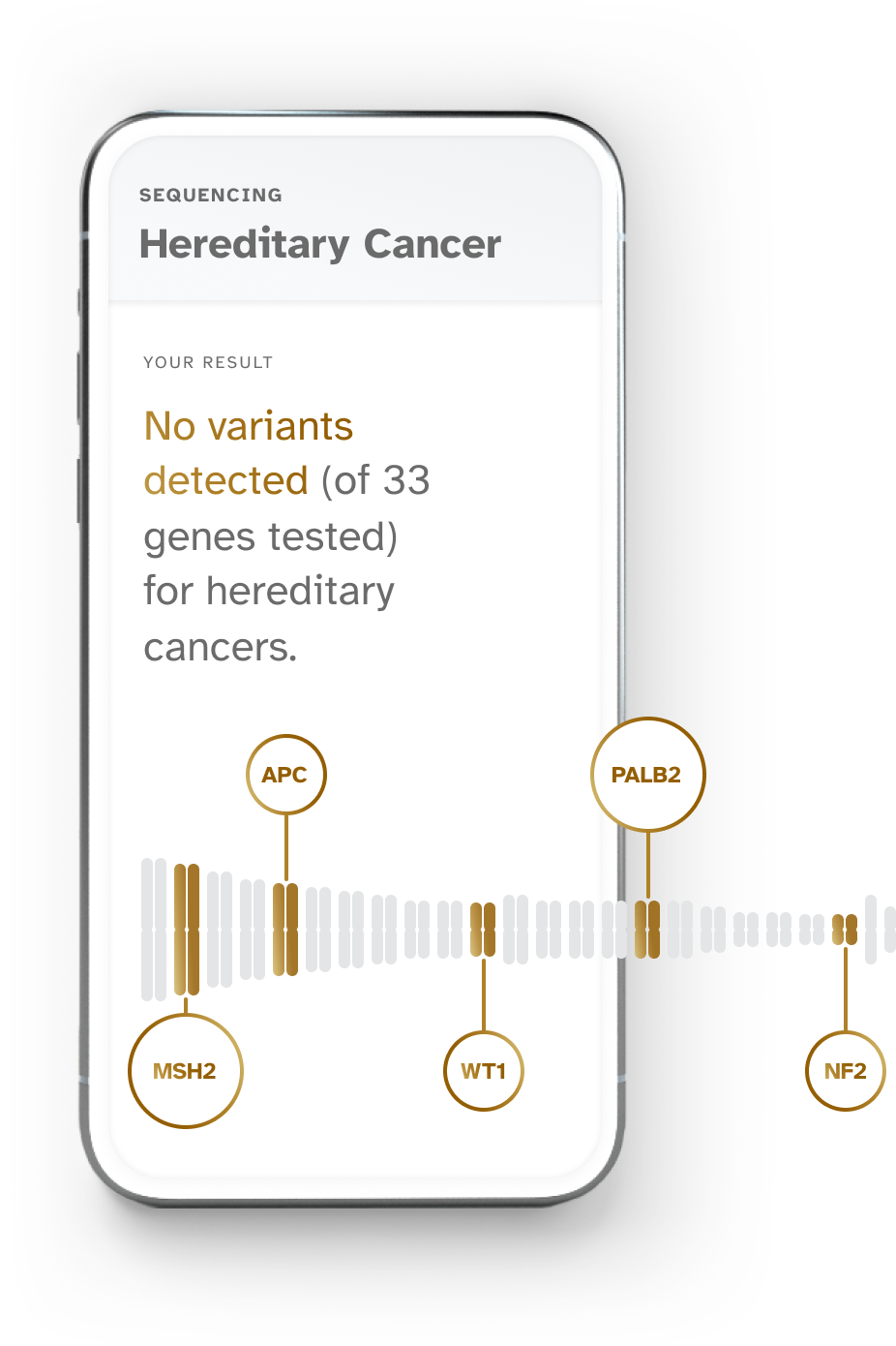 Image Description: A sample result for Hereditary Cancer report; "No variants detected (of 33 genes tested) for hereditary cancers."