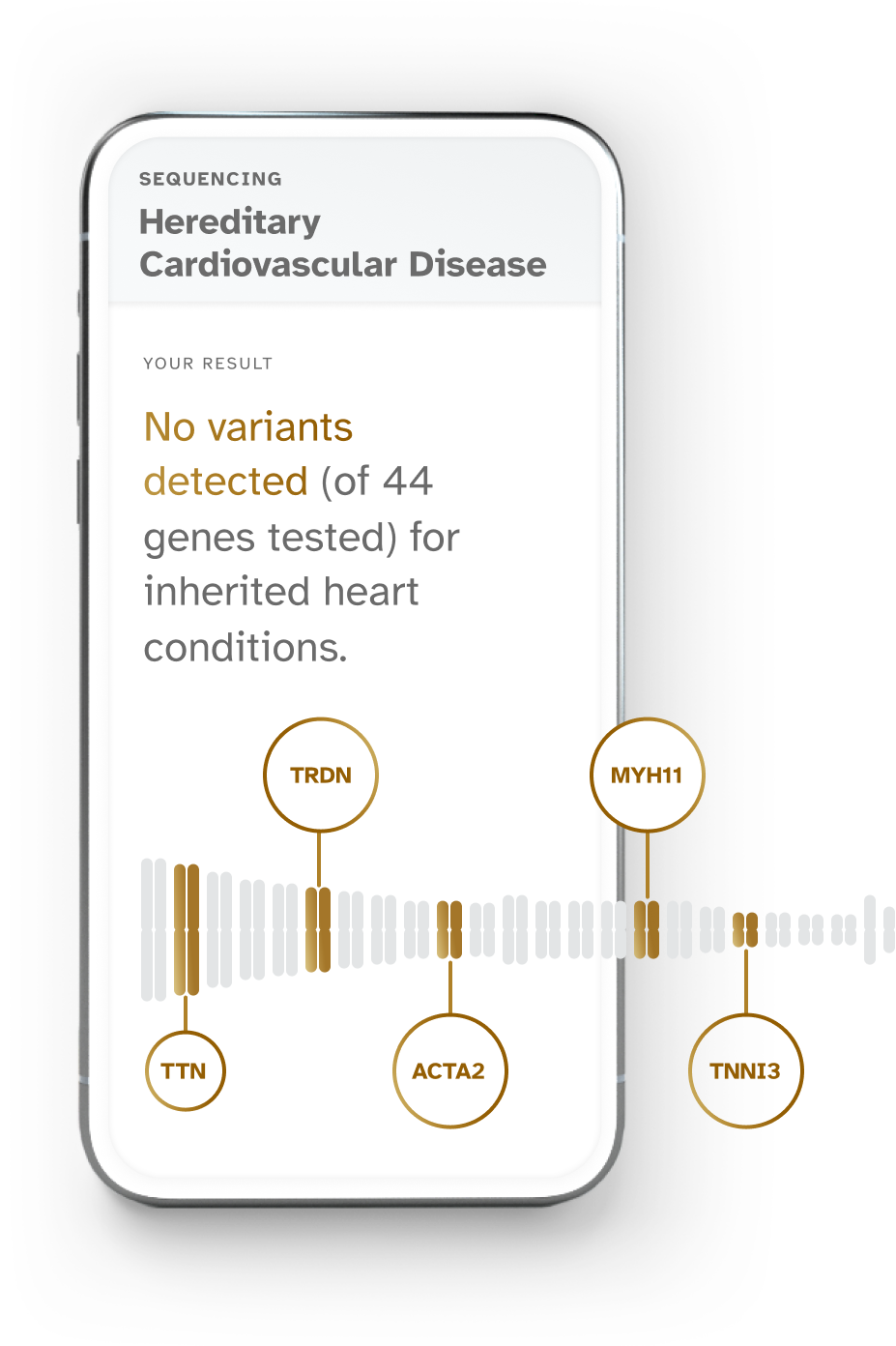 Image Description: A sample result for Hereditary Cardiovascular Disease report; "No variants detected (of 44 genes tested) for inherited heart conditions."
