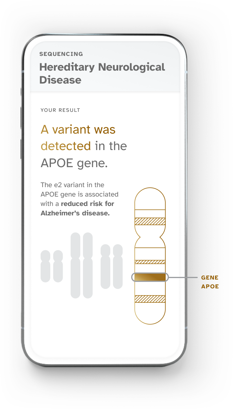 Image Description: A sample result for Hereditary Neurological Disease report; "A variant was detected in the APOE gene." The e2 variant in the APOE gene is associated with a reduced risk for Alzheimer’s disease.