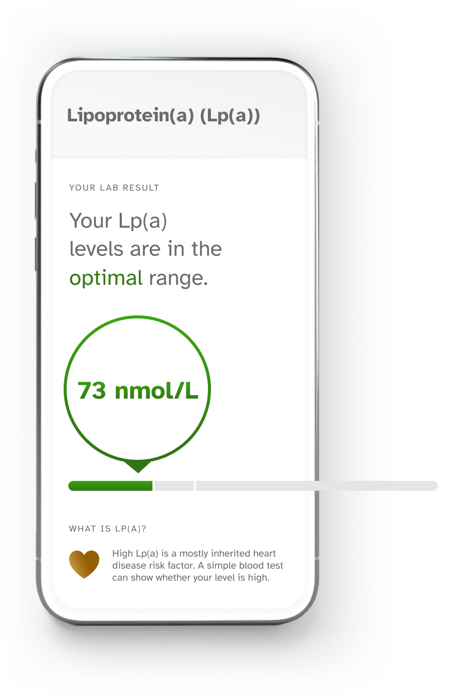 Image Description: A sample result for Lipoprotein(a) (Lp(a)) report; "Your Lp(a) levels are in the optimal range." What is Lp(a)? High Lp(a) is a mostly inherited heart disease risk factor. A simple blood test can show whether your level is high.