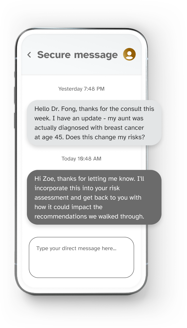 - Access to clinicians with training in genetics-based care: Unlimited direct messaging, plus a dedicated virtual consultation annually.