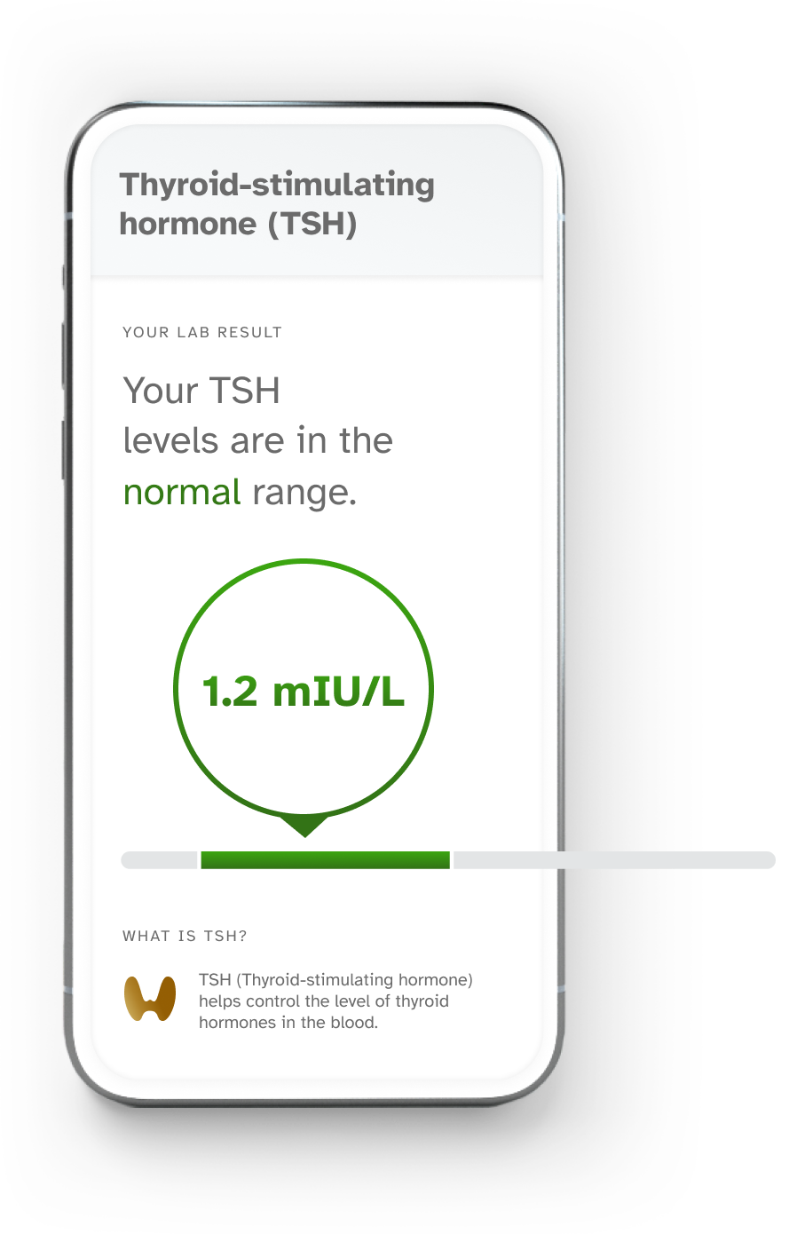 Image Description: A sample result for Thyroid-stimulating hormone (TSH) report; "Your TSH levels are in the normal range." What is TSH? TSH (Thyroid-stimulating hormone) helps control the level of thyroid hormones in the blood.